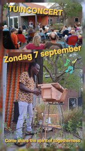 7 September   Tuinconcert bij Loes en Marco.        Hartverwarmende Afrikaanse                                           klanken. Opbrengsten gaan naar                                      “Peace of Africa”